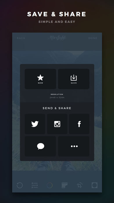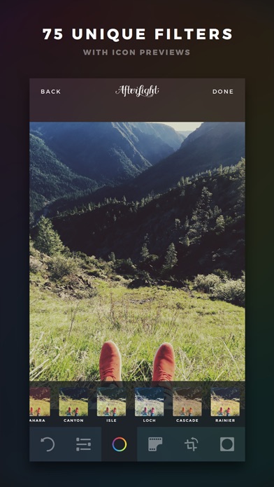 Afterlight is the perfect image editing app for quick and straight forward editing. Our simple design, paired with powerful and snappy tools, will give you the look you want in seconds. 15 ADJUSTMENT TOOLS Use any of our 15 uniquely made adjustment tools to enhance your images to perfection with ease. 79 FILTERS Afterlight has 31 fully adjustable Original Filters, 14 Guest Filters by various Instagram users, 18 Seasons filters, and the new Wander pack including 16 filters. Now including the new Fusion filters, allowing you to mix tools, filters and textures to create your own personal filters. 78 TEXTURES Afterlight includes a range of real and natural light leaks we created with 35mm film and instant film, to simplistic scratchy film textures. CROPPING & TRANSFORMING TOOLS Crop your photos with our quick and easy cropping tool with 15 different presets. Transform your photos with our rotating tool, vertical and horizontal flipping tools, and straightening. Now with the new Double Exposure tool. FRAMES We provide a list of 128 different simplistic and adjustable frames, paired perfectly with Instagram. Now including the new Wallpaper Pack. Have any questions? Contact us! afterlight.us @afterlight facebook.com/afterlightapp