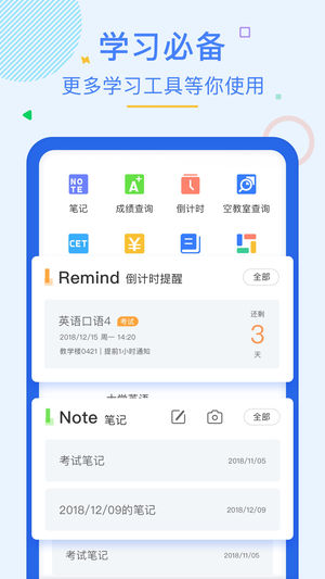 【上大学,一个App就够了】 大学生都在用的智能课表工具软件,直接和高校的教务系统对接,能将你的课表直接导入到手机,课程信息一目了然,从此向打印纸质课表say goodbye!还有上课提醒、成绩查询、考试倒计时等功能,让你的学习&生活更加便捷! 2017新学期,新气象,下课聊社区现已全新改版,全国的大学生都在这里等你来捕捉! 【更快更方便的课表】 超级课程表通过和教务系统对接,直接将你的课表导进手机。课程名、上课地点、上课时间、授课教师等信息一目了然,还可以认识同课堂的同学。更有成绩查询、考试倒计时等实用工具,让你的学习生活更便捷! 【认识校友的新姿势】 每10个大学生,就有8个在使用…