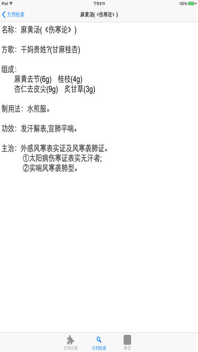 本系统堪称中医方剂大辞典! 中药方剂通俗点说,就是关于中药药物配伍、剂量、剂型以及用量用法的一种指导说明。方剂中的方指医方,剂,古作齐,指调剂,方剂就是治病的药方。 本软件分为:解表剂、泻下剂、和解剂、清热剂、温里剂、补益剂、固涩剂、安神剂 、开窍剂、理气剂、理血剂、消导剂、治风剂、治燥剂、祛湿剂、祛痰剂、治疡剂等21个分类,收载常用方剂1303首,按名称、方歌、组成、用法、功效、主治等项论述。并附录有方剂出处和方剂检索,便于学习与参考。 可以说一款软件在手,就可免去记忆汤头之苦,千余种汤头,完全满足中医临床需要,是学习、开方必备软件。