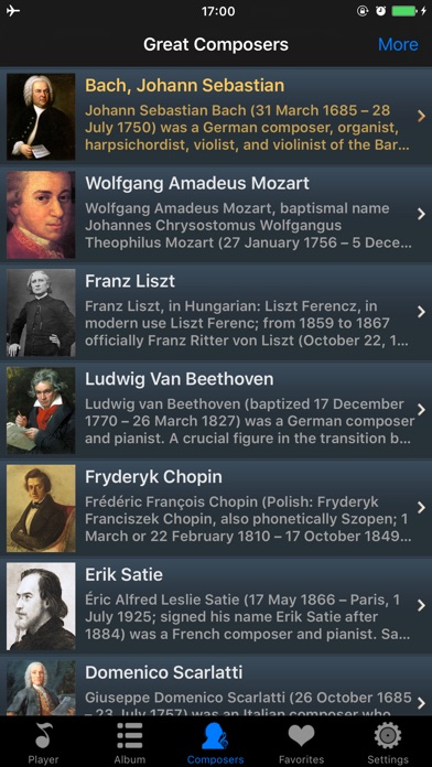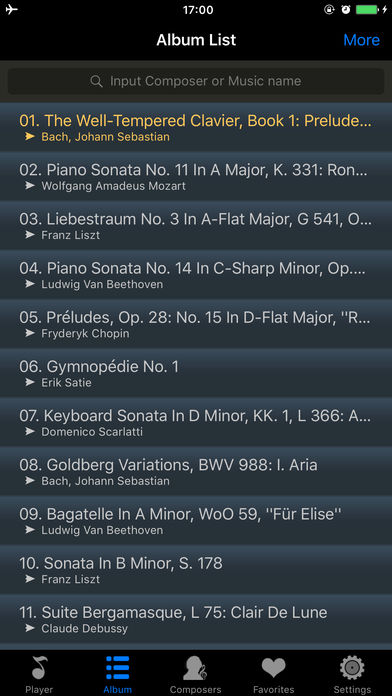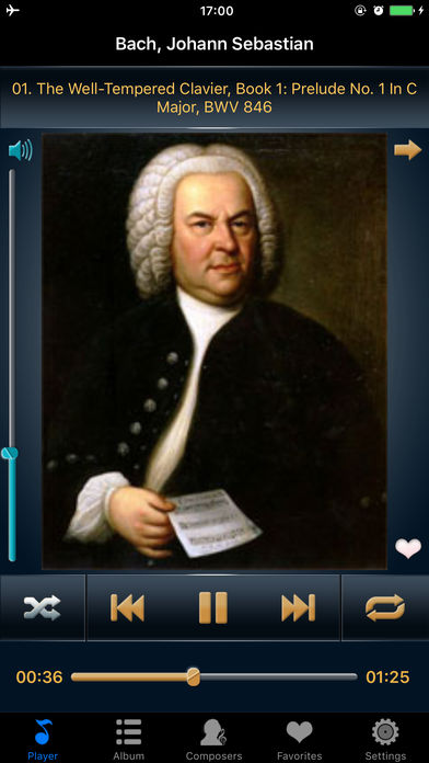 √√带有知识的音乐播放器√√ 您将聆听到20位伟大作曲家创作的99首最好听的钢琴曲, 您将看到伟大作曲家们的肖像, 您将阅读伟大作曲家们的介绍. 您将放松心情, 启迪智慧, 开拓思维, 恢复活力! 听一听, 为了您和您的孩子! √√应用特色√√ -高质量的音乐 -播放顺序: 随机播放或按顺序播放 -重复模式: 单曲重复, 循环播放所有曲目, 循环播放收藏曲目 -音乐列表: 作曲家音乐列表, 收藏音乐列表, 所有音乐列表 -搜索作曲家或曲目 -后台播放 -锁屏或播放时显示作曲家肖像 -锁屏时播放控制(播放/暂停/上一首/下一首) -摇一摇切换音乐 -睡眠定时 -支持iPod, iPhone & iPad -不需要联网,离线工作 √√20位伟大的作曲家和他们创作的99首最好听的钢琴曲√√ -Bach, Johann Sebastian(巴赫) -Wolfgang Amadeus Mozart(莫扎特) -Franz Liszt(李斯特) -Ludwig Van Beethoven(贝多芬) -Fryderyk Chopin(肖邦) -Erik Satie(萨蒂) -Domenico Scarlatti(斯卡拉蒂) -Claude Debussy(德彪西) -Maurice Ravel(拉威尔) -Sergei Rachmaninoff(拉赫曼尼诺夫) -Felix Mendelssohn(门德尔松) -Modest Mussorgsky(穆索尔斯基) -Franz Schubert(舒伯特) -Robert Schumann(舒曼) -Sergei Prokofiev(普罗科耶夫) -Alexandr Scriabin(斯克里亚宾) -Edvard Grieg(格里格) -Arvo Pärt(阿沃.帕特) -Pyotr Il'yich Tchaikovsky(柴可夫斯基) -Mily Balakirev(巴拉基列夫) √√钢琴曲列表√√ 01. 巴赫: 十二平均律钢琴曲集--C大调前奏曲 BWV846 02. 莫扎特: A大调钢琴奏鸣曲 K331 03. 李斯特: 爱之梦(降A小调夜曲第三号) G54 op.62 04. 贝多芬: 升C小调第十四钢琴奏鸣曲(月光奏鸣曲) 05. 肖邦: 降D大调前奏曲 op.28 No.15--水滴 06. 萨蒂: 金诺佩蒂1号 07. 斯卡拉蒂: D大调键盘奏鸣曲 KK. 1, L 366 08. 巴赫: 哥德堡变奏曲 BWV988 09. 贝多芬: 致爱丽丝(A小调小品曲) WoO 59 10. 李斯特: B小调钢琴奏鸣曲 S.187 11. 德彪西: 贝加莫组曲 L75 12. 莫扎特: A小调第八号奏鸣曲 K310 13. 肖邦: 降E大调夜曲 op.9 14. 贝多芬: F小调第二十三钢琴奏鸣曲 ‘热情’ op.57 15. 肖邦: 降A大调第六号波兰舞曲 ‘英雄’op.53 16. 拉威尔: 悼念公主的孔雀舞曲 17. 拉赫曼尼诺夫: 幻想曲作品 3-2.升C小调前奏曲 18. 贝多芬: 第八号钢琴奏鸣曲(悲怆) op.13 19. 肖邦: G小调叙事曲 op.23 20. 德彪西: 前奏曲 Book2 四月斋 21. 贝多芬: C小调第三十二号钢琴奏鸣曲 op.111 第一乐章: 庄严地——有活力的、热情的快板 22. 门德尔松: 无词歌 op.30 23. 德彪西: 2首阿拉伯风格曲 L.66 No.1 24. 贝多芬: C小调第三十二号钢琴奏鸣曲 op.111 第二乐章: 小抒情曲;非常纯朴的、如歌的柔板 25. 肖邦: 降B小调第二号钢琴奏鸣曲 op.35 26. 穆索尔斯基: 图画展览会(漫步) 27. 舒伯特: 降G大调第三即兴曲 op.90 D899 28. 肖邦: E小调第4号前奏曲 op.28 29. 拉威尔: 夜之幽灵 M.55 水妖 30. 贝多芬: C小调第二十一钢琴奏鸣曲华尔斯坦第一乐章 快板 31. 肖邦: 升C小调即兴幻想曲 op.66 32. 肖邦: F小调第一即兴曲 op.142 D935 33. 舒曼: 童年情景 op.15 第七乐章 梦幻曲 34. 肖邦: 降A大调第三叙事曲 op.47 35. 贝多芬: E大调第三十奏鸣曲 op.109 36. 拉威尔: 库普兰之墓 37. 肖邦: B小调第三钢琴奏鸣曲 op.58 38. 李斯特: 升C小调第二号匈牙利狂想曲 S.244 39. 普罗科耶夫: 第七钢琴奏鸣曲 op.83 40. 舒曼: 狂欢节--小场景与四个注脚 41. 肖邦: F小调幻想曲 op.49 42. 德彪西: 版画集--塔 L.100 43. 李斯特: 十二首超技练习曲--第三首 风景 44. 德彪西: 儿童乐园--第六首 木偶的步态舞 45. 斯克里亚宾: 升F大调第五钢琴曲 op.53 46. 格里格: 抒情钢琴小品 Book.8 op.65~第6首 特洛豪根的婚礼日 47. 拉赫曼尼诺夫: 升G小调第12前奏曲 op.32 48. 莫扎特: A小调第八奏鸣曲 K310 49. 李斯特: 降D大调第三号安慰曲 S.172 50. 阿沃.帕特: 致阿丽娜 ...