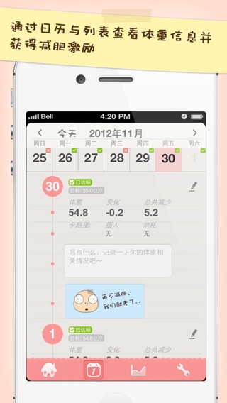 心语体重管家是一款专门为希望减肥与瘦身的女性用户而量身定做的体重记录与跟踪应用。本应用以最简单有效的方式,帮助用户记录减肥过程中的体重数据、卡路里消耗等情况, 并通过图表与日历的方式展现减肥历程与进展,让你的减肥过程充满乐趣与动力。 * 独特功能 * 体重记录 可以创建多个计划来分阶段进行减肥 每天只需要录入一次数据 可以补充录入或修改过去的体重数据 可以记录摄入及消耗的卡路里(可选) 添加日记及照片(可选) * 体重跟踪 从体重曲线中获得减肥的动力及乐趣 输入完体重后,即可立即看到自己的BMI及所处状况 直观地了解自己的减肥进度以及距离目标的差距 以贴纸直观地反应出体重是否达到了每天的减肥预期 * 图表、列表及日历 体重线、趋势线及目标线展示在同一个图表中 可以通过周、月、半年以及一年的时间维度查看曲线 在日历与图表中查看自己的减肥进展情况 可以在图表中查看自己的体重线与趋势线是否吻合 列表与日历巧妙地融合,更方便查看体重信息 * 设置 可以设置启动密码,以更好保护隐私 可以方便地更新自己的常用信息 支持设置单位(英制与米制)与每周开始的时间(周日或周一) 将体重数据导出到CSV及PDF文件中 * 其他 完美支持iOS 6与iPhone 5 拥有亲切温暖的界面风格及最佳的使用体验 心语体重管家是一款拥有绝佳使用体验与温暖界面风格的体重追踪与记录应用,是你减肥过程中的必备小助手。