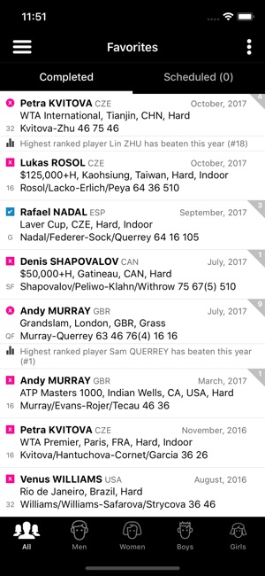 All tennis results in one place - ATP, WTA, ITF, Juniors and more. Resultina covers all professional (ATP, WTA and ITF sanctioned events) singles matches as well as ITF Juniors. Features: - Favorite player notifications - results & draws - Tournament calendars - Complete player activity - Player s…