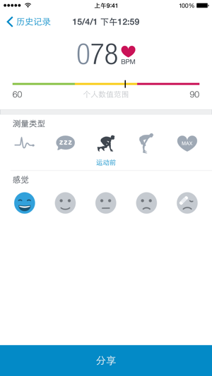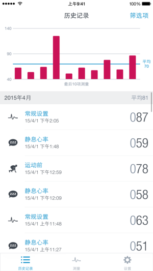 将你的iPhone瞬间转换成你的个人心率监测器!就这么简单! App专业版的功能与福利: - 无限量的测量次数:随时随地,你可以想多频繁就多频繁地来测出你的心率 - 使用筛选功能:根据类型,如静息心率,健身训练前后心率,最高心率来对你的测量进行筛选 - 以图表形式来监控你的进展:监控你静息心率的发展状况 - 提醒通知:接受有规律的心率测量方面的自动消息通知 - 无广告 App的功能与福利: - 用你iPhone的照相机摄像头来测量你的心率 - 以图表形式显示你心率测量的结果 - 不同的测量形式:静息心率,健身训练前后心率,最高心率 - 将你的测量结果上传至Runtastic.com…