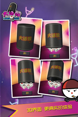 ###大陆,台湾,香港,澳门等多地骰子类游戏排名前列### 大话骰(“大话”是粤语中的“谎话”),又称“步步高升”,在台湾叫“吹牛”,是一种骰子游戏。“大话骰”游戏是酒吧内非常流行的游戏,顾客喜欢在酒吧内游玩这游戏,因为输了的参加者要喝酒。另外,大话骰在台湾也因为综艺节目“小气大财神”而非常流行。 我们把这热门游戏移植到iPhone上,方便大家随时随地进行游戏,无需骰盅,不受限制,拿出iPhone就能游戏. 我们更加入了本地多人对战,支持WIFI和蓝牙连接,让大家在嘈杂的环境下也能得心应手的和朋友进行游戏.赶紧叫上亲朋好友下载这款应用,开始摇骰盅吧!