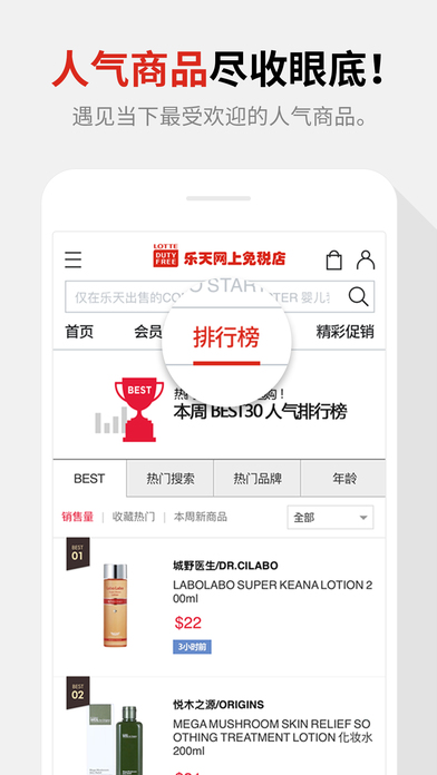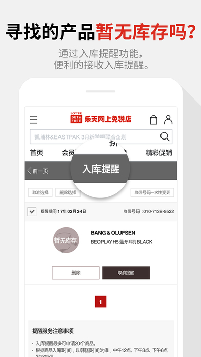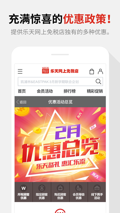 [乐天免税店专享优惠] - 赠送现金积分1万韩元 - 按购买金额最多85+1万韩元 - 下载手机APP,赠送5千韩元 [便利服务] 1.使用指纹识别功能,可实现支付宝/微信账户的安全便捷登录。 2.所找商品暂无库存,可用入库提醒功能随时随地接收提醒。 3.向顾客推荐定制的商品。 4.不怕时间紧迫,由仁川机场出境3小时前,由金浦机场出境前5小时前可以购买。 *关于同意应用程序访问权限的指南 乐天免税店根据情报通信网法第22组2(同意访问权限)的规定,对因下列目的需要访问权限的项目,可通知顾客并在获取同意后更改应用程序内设置。拒绝选择性的访问权限也可以使用购物服务。 [选择性访问权限] - 通知:活动通知,定制商品推荐,秘密优惠券发放 - 相机:扫描QR码,登记护照照片 - 照片:使用储存的照片 ※ 权限变更 设置>乐天免税店>允许应用程序访问 ※客服中心 网上购物咨询 : +82-1688-3555 咨询时间 : 08:00~23:00