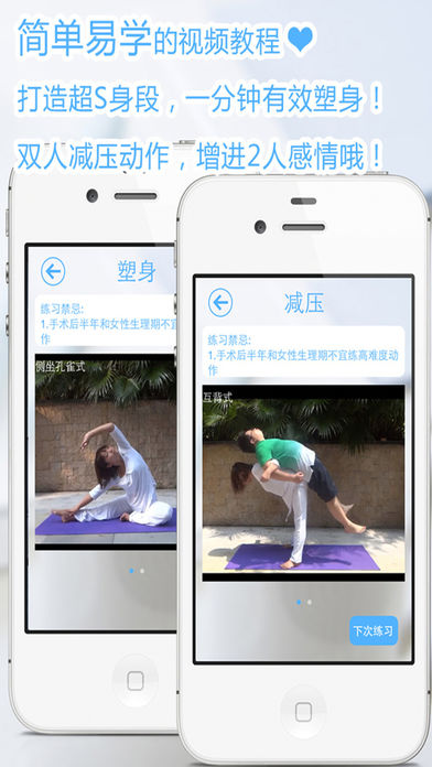 瑜伽是一个通过提升意识,帮助人类充分发挥潜能的体系。瑜伽姿势运用古老而易于掌握的技巧,改善人们生理、心理、情感和精神方面的能力,是一种达到身体、心灵与精神和谐统一的运动方式。 白领们巨大的工作压力很损耗精神,久站或久坐的工作习惯对身体的损害是慢性而隐蔽的,而瑜伽可以很好地为白领们调节身心,所以《瑜伽教练视频》贴心为白领朋友设计的这4套办公室瑜伽动作,生动视频教学清晰详尽,还可以选择DIY,随心搭配动作顺序!配合语音指导,再也不用担心你的动作不标准!下载《瑜伽教练视频》,跟美女教练减肥美体、放松身心!