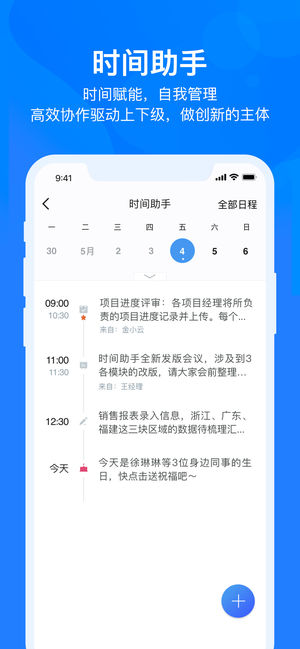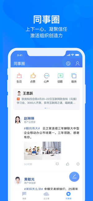 云之家是国内专业领先的移动办公平台,以“赋能个体,激活组织”为产品理念,创新金蝶25年管理经验,通过移动、社交、大数据、人工智能等先进技术,打造安全、专业、智能、极致的一站式协同工作方式。 云之家V10推出三大赋能场景: 时间赋能:“时间助手”满足个人时间管理需求,通过日程共享实现团队成员时间安排透明化,提升协作效率。 数据赋能:“报表秀秀”可快速连接ERP,对不同角色提供分权限管理,定制报表供员工订阅,随时查看。 文化赋能:“同事圈”是线上互动社区,汇集员工心声,助力高层决策及管理优化。 据研究机构IDC数据显示,金蝶云之家在大中型企业市场占有率排名第一,知名用户包括万科、海尔、海…