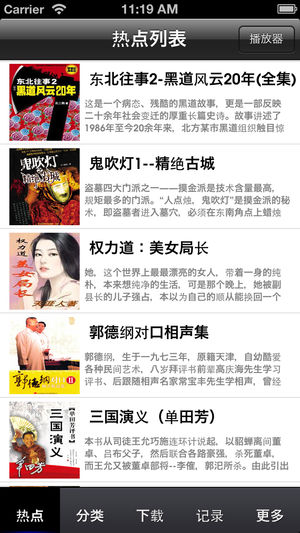 动听中国,最大有声读物在线平台,悄然回归,再续激情。 1 有声小说在线收听,也可提前下载离线收听 2 言情,评书,都市,相声等二十个频道,千万部有声读物 3 某些频道未成年,慎重收听 4 高品质的声音,带给您身临其境的感受 5 热点功能,点播最多的读物排行,方便收听 详细介绍: 热点列表是根据点播最多读物排行,当前列表为:飘飘欲仙、东北往事2-黑道风云20年、郭德纲对口相声全集、鬼吹灯1--精绝古城、金鳞岂是池中物、实用风水(易经运用到都市风水,实用风水讲解)、三国演义(单田芳)、蓝天航空公司的空姐、养生(都市快节奏养生秘诀)、两性笑话集、减肥瘦身(不吃药,不节食,听大师讲怎么轻松瘦身)、老…