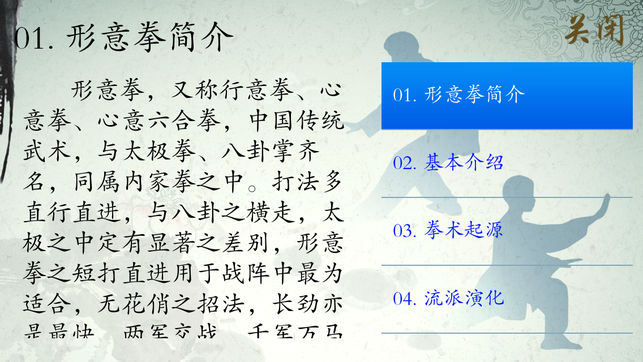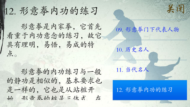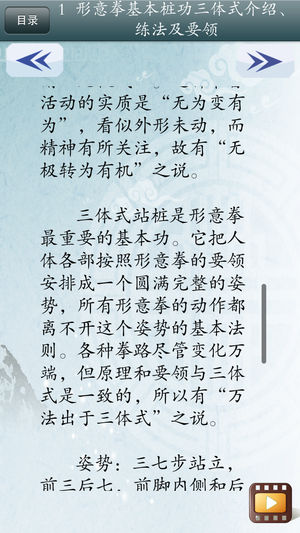 形意拳,又称行意拳、心意拳、心意六合拳,中国传统武术,与太极拳、八卦掌齐名,同属内家拳之中。打法多直行直进,与八卦之横走,太极之中定有显著之差别,形意拳之短打直进用于战阵中最为适合,无花俏之招法,长劲亦是最快,两军交战,千军万马中,要能有闪转腾挪之地不易,只有直行直进,走亦打,打亦走,如黄河之决堤。 产品示范视频主要介绍了形意拳基本桩功三体式(介绍、练法、要领、教学演练)和形意十二形拳(龙、虎、猴、马、鼍、鸡、燕、鹞、蛇、骀、鹰、熊)。并配有形意拳基础知识相关介绍(形意拳简介、拳术起源、流派演化、各派形意拳内容、拳术特点、训练方式、拳谱文献、形意拳门下代表人物…