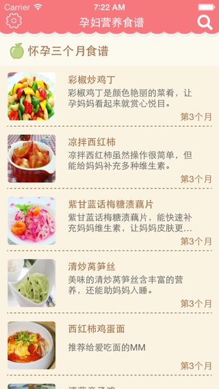 ^_^ ^_^ 生机饱满的胎儿营养,多彩鲜艳的胃口,绿意盎然的心情,我们给予您最全面的关怀。美食带宝宝初次感受世界,感受到您。感受您满满的情意,恬雅的心境。 应用程序简介: 1.为怀孕妈妈精心准备1~10个月健康饮食菜谱,全程贴心陪伴孕期。 2.更有优生食谱,孕期补血食谱,孕期补充维生素食谱,全方位呵护孕妈妈健康。 3.支持全文检索、关键字查询。 4.购物单菜谱收藏功能,方便您及时调出购物信息。 5.优美合理的布局界面,效率护眼。 6.信息本地储存无需连接网络。 7.为您奉上全球各地可爱宝宝的美图,愿您即将出生的小家伙和他们一样健康成长。 我们将不断更新数据,升级版本。谢谢您的支持和鼓励...