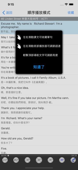 *加入语速调节功能,播放器上任意位置手指左右滑动即可变速 *加入单句收藏功能,播放时手指左右滑动课文即可收藏自己喜欢的句子,学习更加方便 *加入耳机线控操作,使用更加方便快捷!请仔细阅读操作说明,获得最佳使用体验! *加入亮度调节功能,适应不同光线变化,保护眼睛 *欢迎向我们提出更多改进建议,帮助我们提升使用体验。如果您觉得满意,给个评价鼓励下吧 本APP每课都配有详细的中文字幕,并配以强大的可跟读复读的播放器,单词即按即查(联想记忆、常用词组、同义词辨析等),课文内容轻松点读、口语跟读练习、支持后台播放、多种播放学习模式! 应用内分免费与付费内容两部分,所有功能均免费开放。欢迎使用体验…