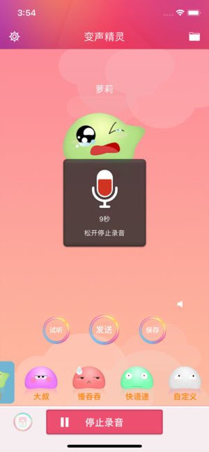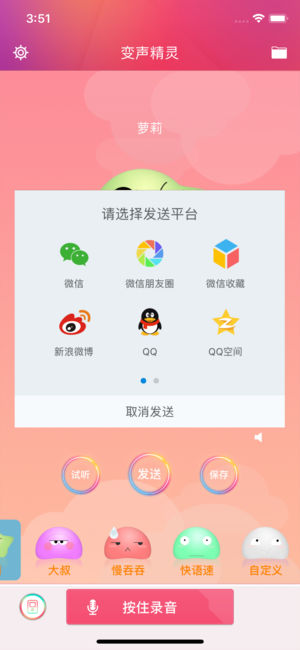 -----女生最爱的萌系变声器 大叔瞬间变小萝莉!----- 还在对一成不变的语音聊天感到厌烦? 女生想用超嗲萝莉音吸引帅哥? 男生想用更Man的磁性声音征服妹子? 或者男生想变女声来迷惑帅哥?! 《变声精灵》能够感满足你并且具备以下特点: ◆AppStore下载量超过130万 ◆木棉女生网编辑推荐专供美眉勾引帅锅的搞怪变声软件 ◆用丰富多变的声音让你的微信语音聊天更有意思 ◆支持歌曲变声,随意变换明星歌曲的声音,想怎么搞怪就怎么搞怪 ◆支持微信好友、微信朋友圈、新浪微博、腾讯微博、QQ、QQ空间、邮件发送文件 ◆集变声、录音和音效播放于一身,还能本地保存喜欢的录音 ◆操作简单,功能强大,…