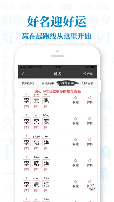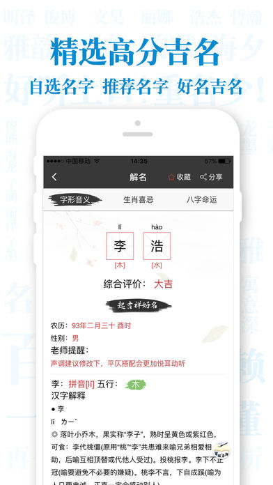 最专业的起名解名软件,宝宝起名测名改名百科全书,结合三才五格、生辰八字,给宝宝起好名。 App Store上工具类排名前列的名字类应用! 宝宝最专业的起名工具! 大家都在用的名字测算手机App! 不怕生坏命,最怕改错名!姓名是人生最大的咒语,姓名的好坏足以影响人生的命运和事业成败,想要更容易获得成功,就需要有一个适合自己的好名字。 【起名解名】专业研究名字学30年,一个好名助您走向成功! 应用特邀专业起名专家玄缘老师方法指导,起名和解名一个应用就足够!姓名并不只是人的一个称呼,更是人的一种符咒。它在相当大的程度上约束了一个人一生的发展,一个人的成就大小、顺逆变换,都与姓名有很大关系。这其实与八字、风水等玄学的道理是一脉相通的,因为名字是属于个人所独有的,当别人称呼我们姓名的时候,其实等同于对我们念咒语。这相当于别人祝福会为您带来正能量,诅咒会为您带来负能量一样。 好的名字必须从人的八字出发,深度剖析八字中的信息,再结合人的性别、属相、汉字音律、意义、字形等方面,才能取得好名。不要埋怨命不好,是您没有对自己负责任,名字不好我们帮您补救! 【起名解名】特点: 1.起名方法继承传统命理起名学优点,结合五行喜用,三才五格、生肖喜忌、字义音义,各个方位全面解读名字意义! 2.分析八字信息,三才五格,透过姓名看人生。 3.起名同样是根据传统姓名学知识,通过层层信息的筛选,用自选名字,推荐名字,天降吉名,三种符合用户操作的方式。总有一个好名让您一生顺利! 4.起名解名的历史记录符合用户的使用习惯,并且提供收藏名字为准爸妈提供方便。 5.命理解码,提供多样化的工具,紫微八字命盘分析,每年运程分析,让您找到正确方向,年年顺利不再是梦! 6.起名知识让你了解更多周易和姓名学的知识,給宝宝选个好名字。 微信灵机提供了各类精准运势测算、专业命理app免费下载、最新命理资讯、大师亲算等多项服务。 想体验最受欢迎灵机命理馆的专业服务,您只需要在“微信”上通过搜索,找到我们。方式是: 1.添加朋友->查找微信公众帐号->输入“灵机妙算”,确认搜索即可。 2.添加朋友->搜号码->输入“lingjimiaosuan”,确认关注即可。 算卦占卜灵接触:http://www.linghit.com 灵接触手机网站:http://m.linghit.com 想要获得更多相关信息,可以登陆https://www.facebook.com/linghit与我们互动。