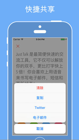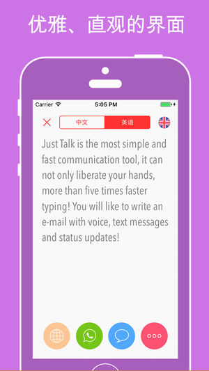 Just Talk 是一款简单而强大的语音转文字应用,可用于将语音迅速转换成文字。 :: :: 主要功能:: :: - 把您的话翻译为40种语言。 - 直接从应用发送电子邮件、文本和 WhatsApp 消息。 - 发布微博。 - 复制文本供在其他应用中使用。 - 漂亮而简约的设计 :: :: 支持的语言 :: :: - 阿拉伯语 - 捷克语 - 丹麦语 - 英语 (英国) - 英语 (美国) - 英语 (澳大利亚) - 中文 - 中文(繁体) - 中文 (香港) - 日语 - 韩语 - 法语 (法国) - 法语 (加拿大) - 荷兰语 (荷兰) - 芬兰语 - 德语 - 希腊语…