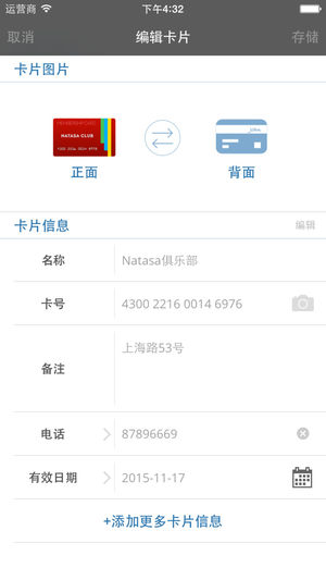 卡片太多,钱包太鼓?每天出门不知道钱包里该带哪些卡片?需要使用某张卡片时,打开钱包却发现没带?需要使用信用卡时,由于记不住卡号和有效日期而烦恼?钱包装了太多卡片,担心钱包丢失而失去所有卡片? 没有问题,立刻还击!今天就安装卡片管家,让卡片管家自动扫描每一张卡片的正面和背面图片,再为卡片添加上必要的名称和信息备注。无论您有多少卡片(身份证、社保卡、居住证、会员卡、银行卡、信用卡...),只要拥有了卡片管家,就可以轻松地管理和愉快地使用您所有的卡片,从此钱包再也不用满满地装着所有卡片,从此让卡片管家为您随时随地呈现每一张卡片的所有信息。 卡片管家支持卡片分类,您可以添加、删除、编辑、自定义…